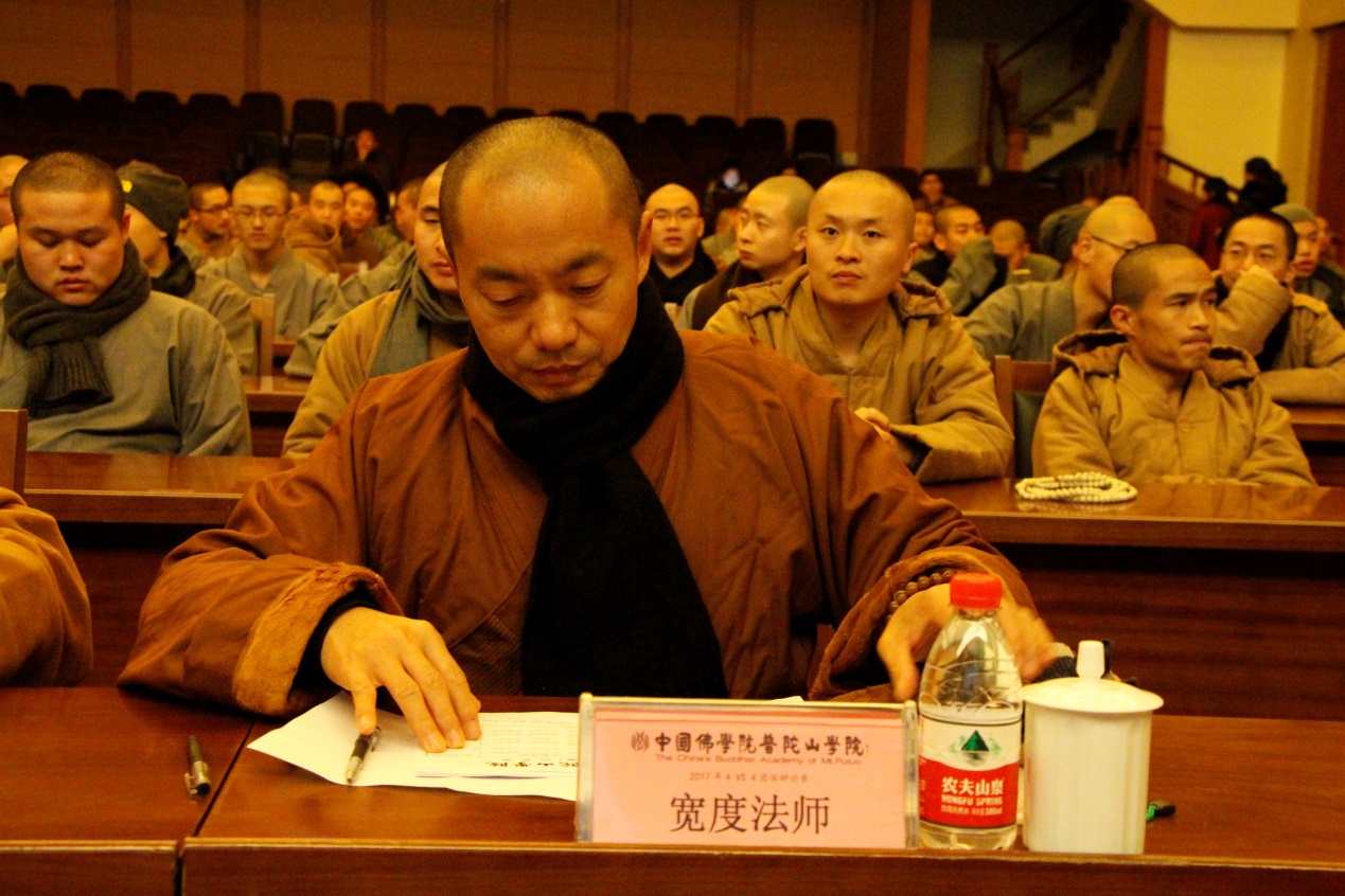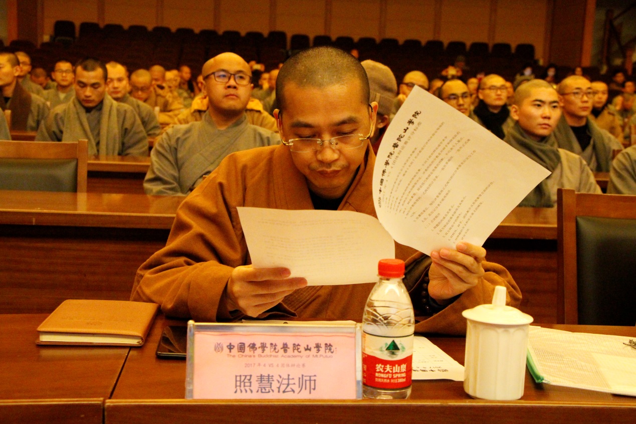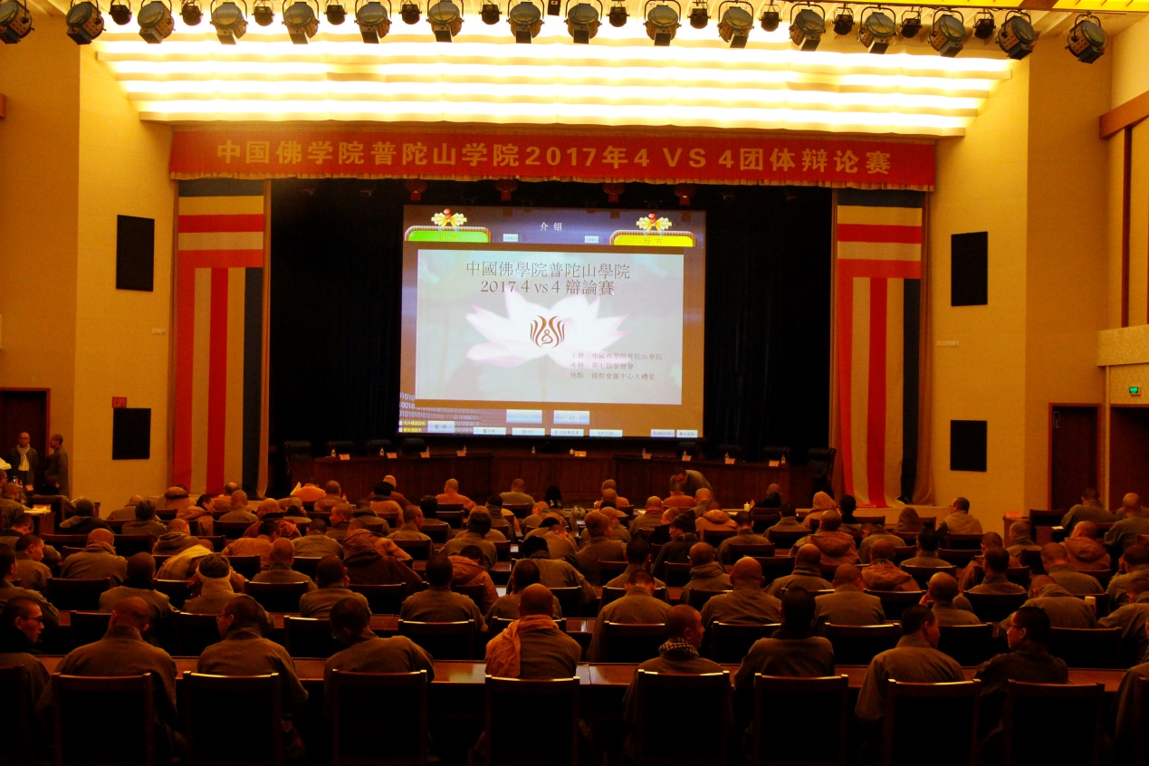 2017年12月17日,由中国佛学院普陀山学院主办,学院学僧会承办的中国佛学院普陀山学院2017年4VS4团体辩论赛,在学院国际会议中心举行开幕式及初赛首场辩论。学院副院长兼总务长界定法师,学院教务长能进法师,学院副教务长宽度法师、照慧法师,学院教研基地副主任心举法师,学院续圣法师、智明法师等应邀出席开幕式,并担任首场辩论赛评委。,此外,参加开幕式的还有2016级本科班主任昭悟法师、2016级预科班主任慧智法师、2017级本科班主任觉道法师、2017级预科班主任悟果法师,以及全院全体学僧、护法居士等。