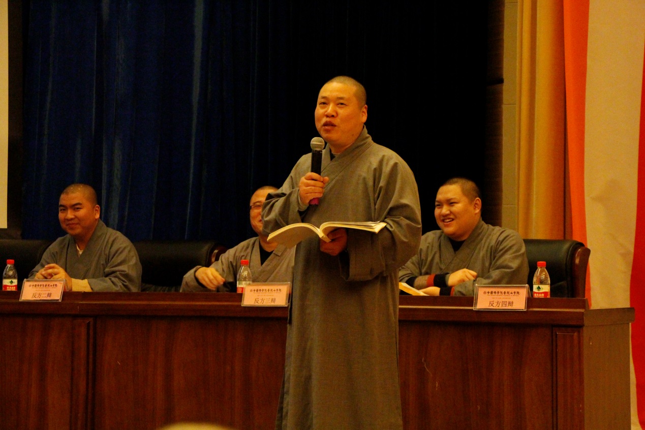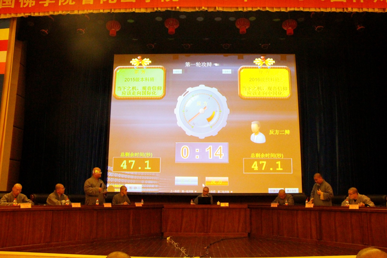 开幕式后,辩论赛初赛第一场正式开始,2015级本科班队和2016级预科班队围绕正方“当下之机,观音信仰应走向国际化”和反方“当下之机,观音信仰应走向中国化”的论题展开辩论。经过一辩陈词、盘问、盘问总结、自由辩论、总结陈词等五个阶段,双方妙语联珠、引经据论,激烈地往来交锋,最后,正方2015级本科班队取得了此场比赛胜利,正方四辩衍化师荣获本场最佳辩手。